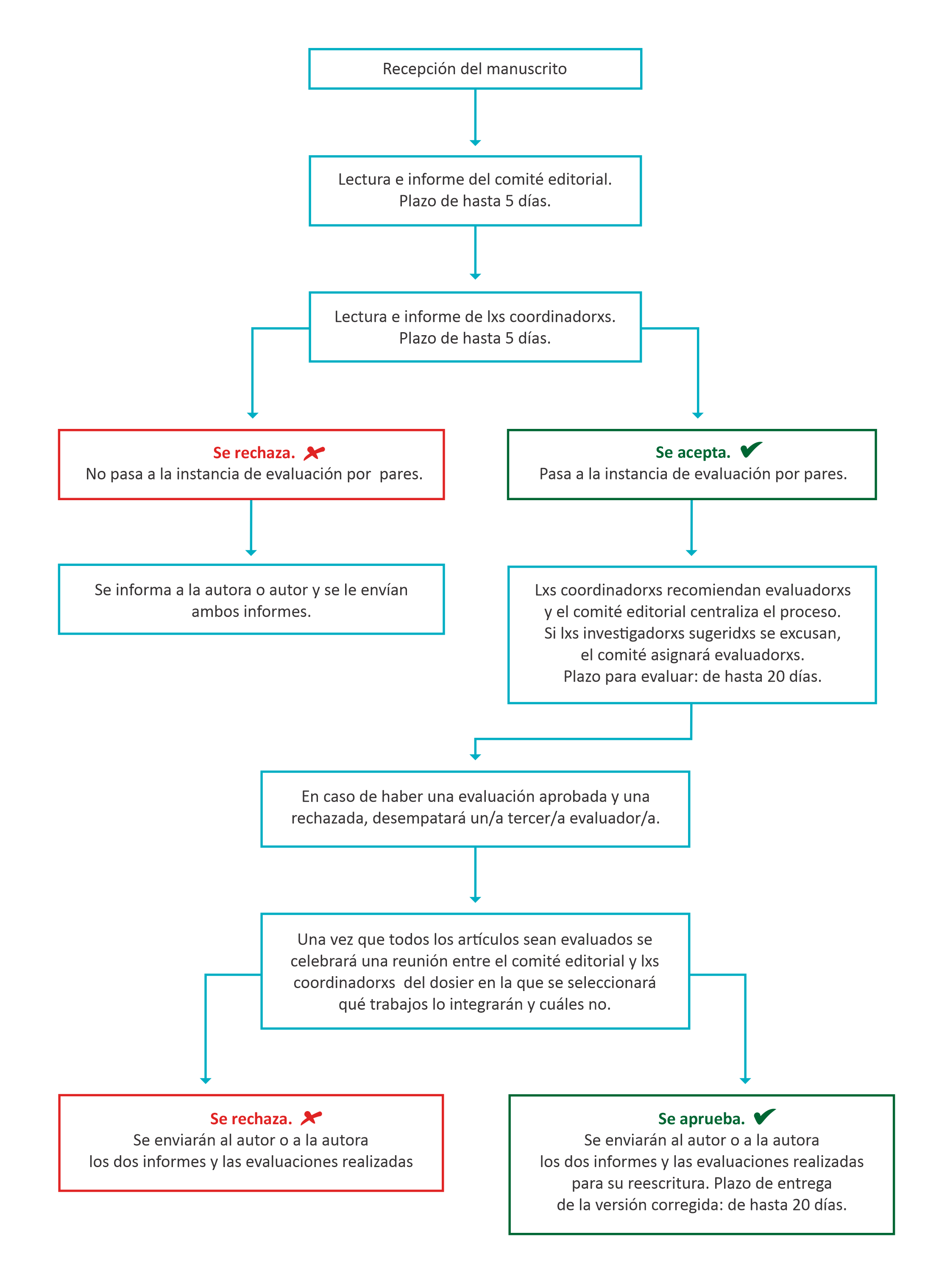 - Una vez concluida la etapa de evaluación, el comité editorial y lxs coordinadorxs celebrarán una reunión conjunta para determinar qué trabajos formarán parte del dosier y cuáles no.